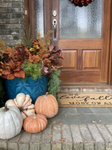 -Spruce up the front porch with some faux or fresh pumpkins, a pretty flower pot arrangement and a fresh door mat.