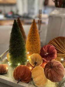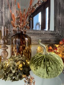 -Style your entryway with some beautiful autumn tones. I love velvet pumpkins mixed with colored glass, metal and faux flowers. And don’t forget the twinkle lights.