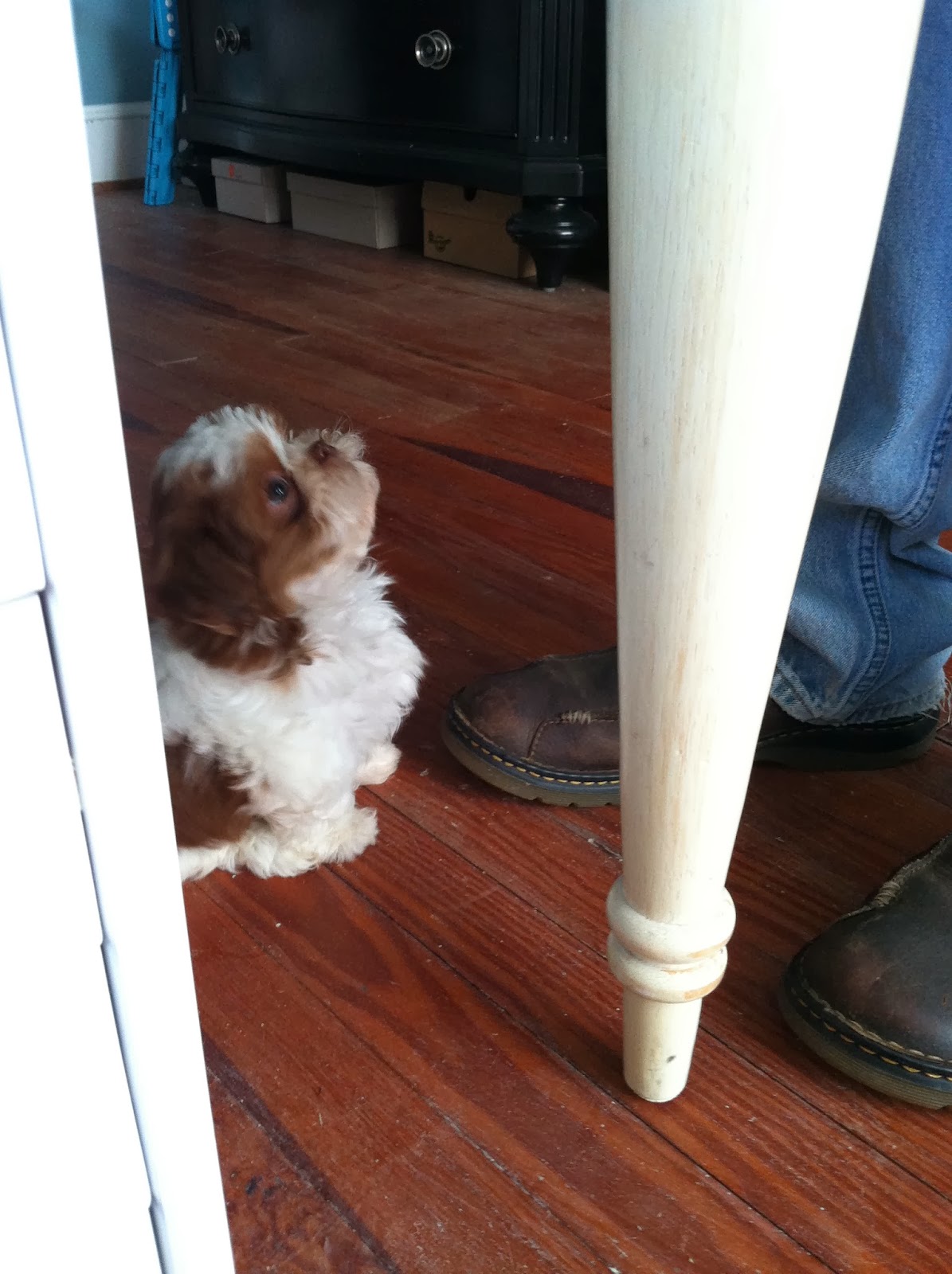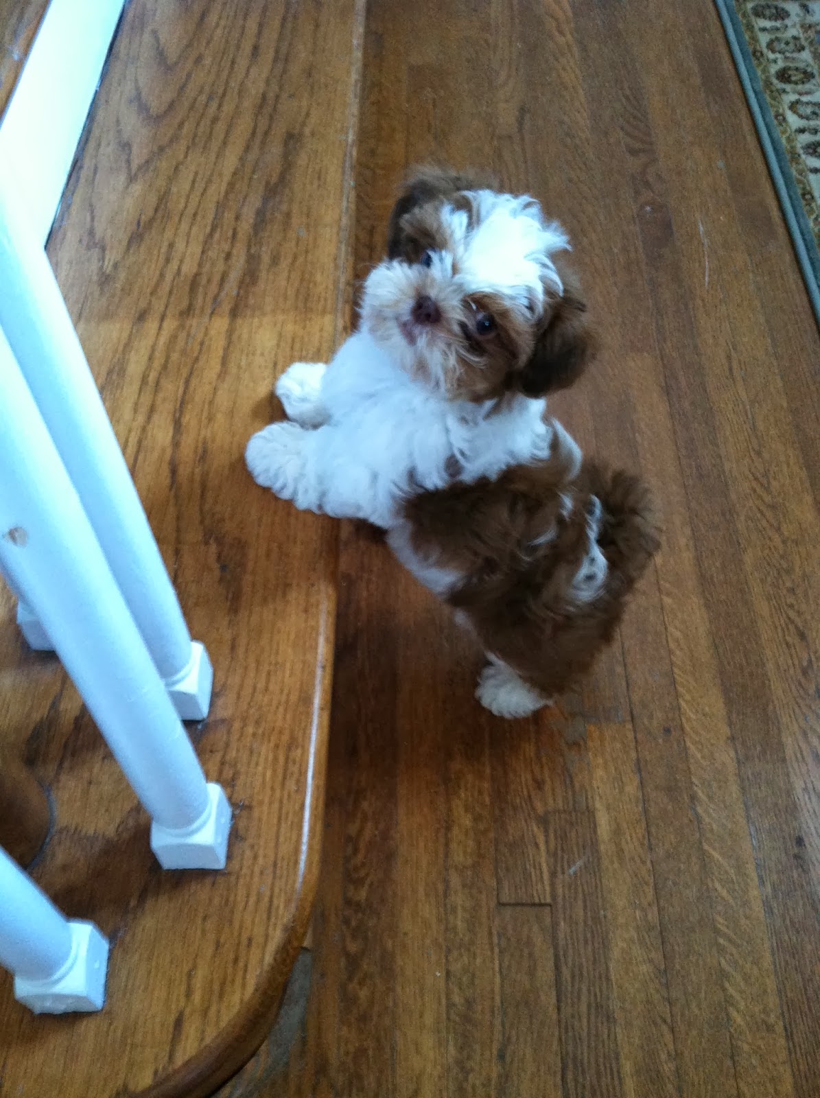 Meet William, our shihchon, a mix of a Bichon Frise and Shihtzu.  We got him when he was 8 weeks old and not even 3 pounds.  He is almost 12 weeks now.  He is cute as a button and light as a feather.  But 100% puppy!